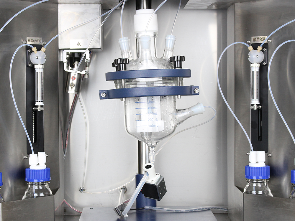 沖洗時(shí),先將夾管閥打開排除廢液,排完關(guān)閉夾管閥,泵5往反應(yīng)釜內(nèi)沖入水,攪拌器攪拌水流清洗反應(yīng)釜后,再打開夾管閥把反應(yīng)釜內(nèi)廢液排入廢液桶。